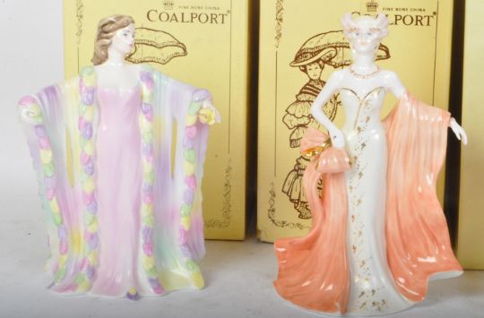 A collection of five 20th century Coalport bone china limited edition hand painted David Shilling Collection. The lot to include "Surprise Celebration" n. 342 of 100, "Bedtime Story" n. 324 of 1000, "Twenties Party" n. 268 of 1000, "Foxy Lady" n. 351 of 1000, "Dinner at Eight" n. 352 of 1000. Coming in original box. Tallest measuring 22cm.