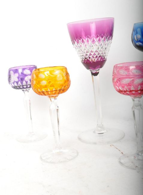 A collection of early 20th century Czechoslovakian bohemian lead crystal drinking glasses in a variety of colours with faceted stems. Measures 19cm tall. Good overall condition.