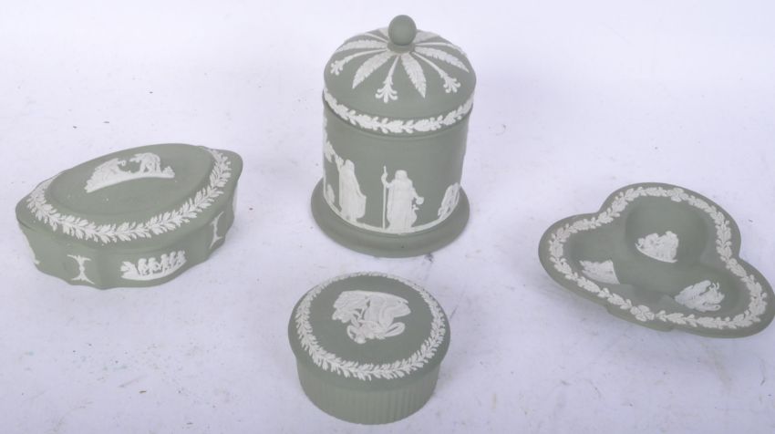 Late 19th Century green Wedgwood jasperware stoneware items including; lidded pot, and jar and pin dish. Measures approx. 11cm