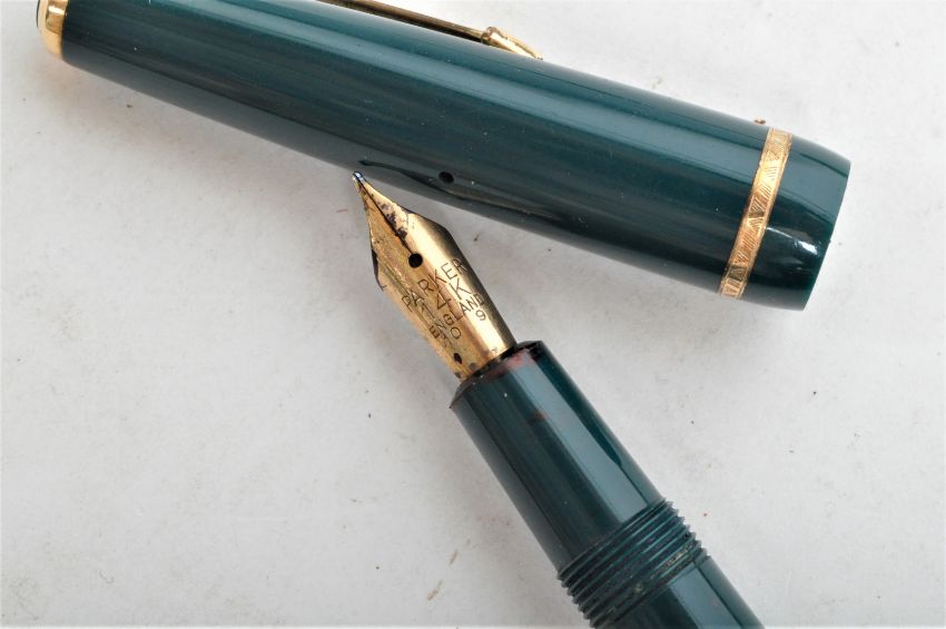 Two vintage mid 20th century circa 1960s Parker 17 lady fountain pen & pencil in dark green acrylic cases. The fountain pen having a 14ct gold nib. Both in original box. Fountain pen measuring 13cm length.