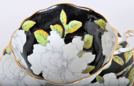 Two mid 20th century Paragon Peony flower hand painted & printed tea cups & saucers. The lot having black background with white peonies & leaves. All marked to base "Paragon by appointment to H.M the Queen & H.M Queen Mary". The lot appears in overall good conditions with no crazing, one cup does appear to have a crack down the side.