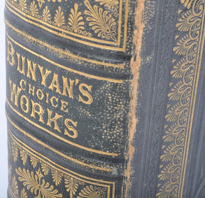 Bunyan's Choice Works - 1864 J. G. Murdoch illustrated book. The Pilgrim's progress - The Holy War, the barren fig-tree, Grace abounding to the chief of sinners, and heart's ease in heart trouble. Dark leather boards with gold/gilt writing and ornate illustrations/decorations. Measures approx. Condition; Worn cover commensurate with age, no rips or tears.