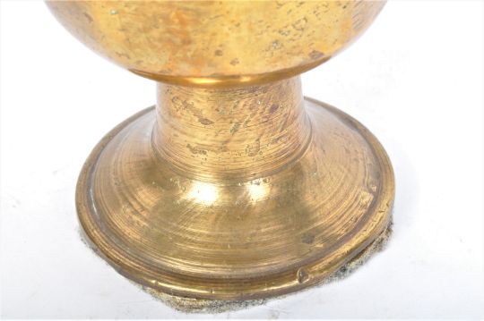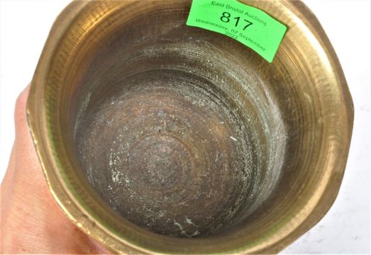 An early 20th century Turkish Middle Eastern brass mortar & pestle having a faceted cup raised on a round base. It measures approx. 15cm tall.