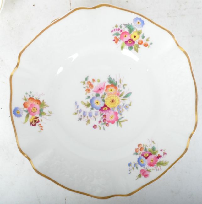 An early 20th century Copeland Spode part dinner service having polychrome floral decoration with gilt edging. Makers stamp to the underside. Retailer stamp of Waring and Gillows.