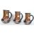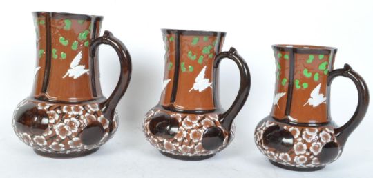 After Christopher Dresser - A trio of matching handled jugs. With a shaped top, brown tapering body and a bulbous bottoms, with floral and bird decoration.  Markings to underside. Tallest measures 20cm.