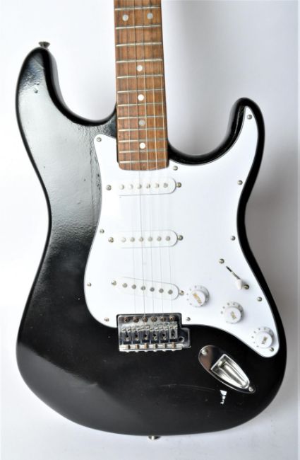 Fender - Squier - Stratocaster. A pair of six string electric guitars. (one missing a string) With a curvy maple body, one has been sprayed black. Indian laurel fingerboard adorned with dot position inlays. Measures approx. 101cm long