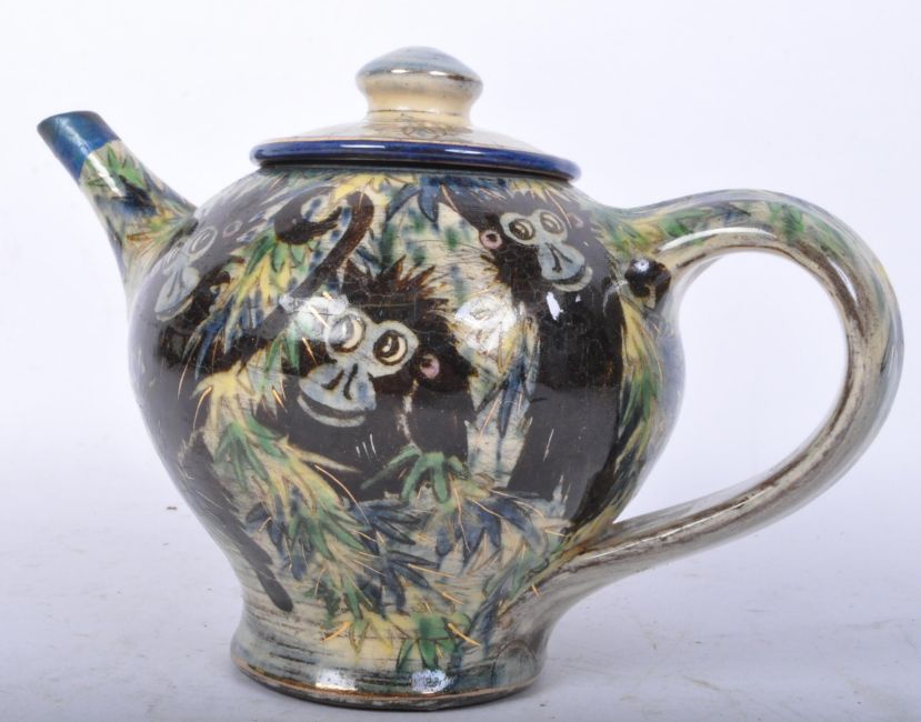 Nick Chapman - 1994 - Monkey teapot. Of typical form, with lid, foliage decoration with Monkeys with curved handle. Marked to bottom. Crazing throughout measures approx. 13cm tall.