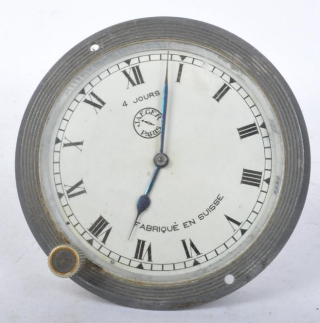A 1920's Art Deco Jaeger Paris Fabrique En Suisse car clock. The clock having a round dial with roman numerals to the chapter ring, set within a white metal case with crown to eight. Measures 9cm diameter.