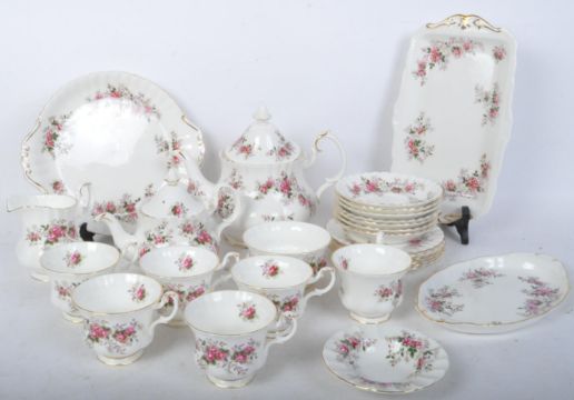 Royal Albert Lavender Rose fine bone china tea service. Comprising of tea pot, water pot, cups, saucers, serving platter, serving dish, side plates. Measures approx. 21cm tall.