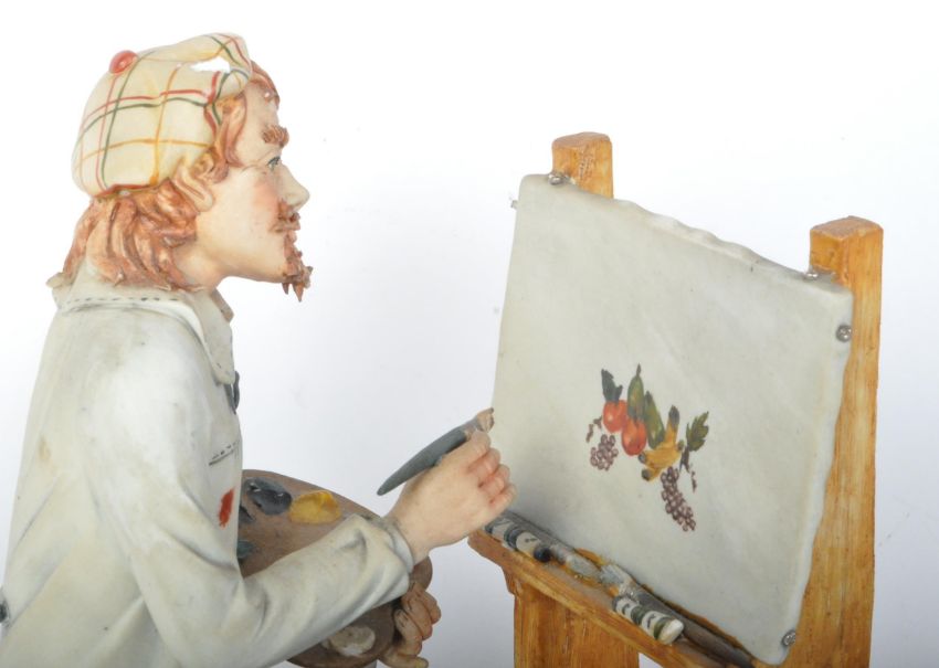 A vintage 20th century Capodimonte porcelain figurine of the artist having a man standing in front of an easel raised on a circular base. Comes with a certificate of authenticity. Measures 34cm high.