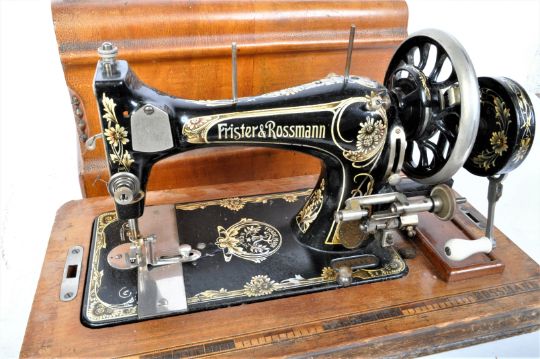 An early 20th century Frister & Rossmann sewing machine in wooden case. The sewing machine having a black body with gilt lettering and patterning. Measures 46cm length.