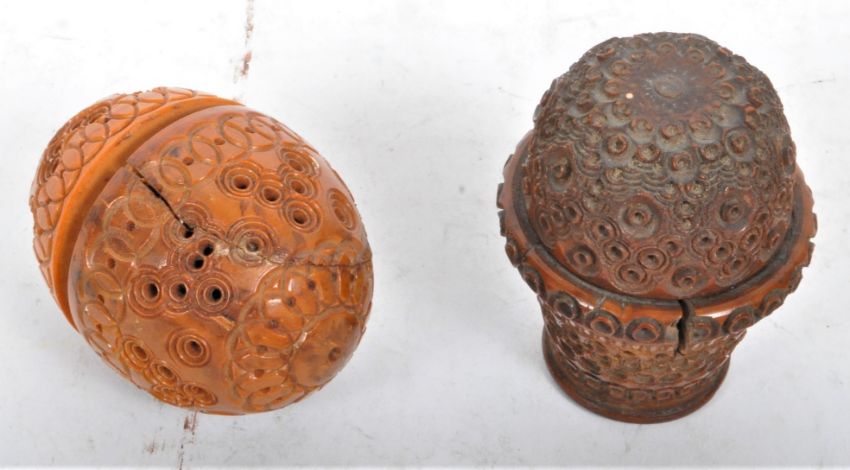 Two early 20th century carved corozo coquilla sewing nut pot, with one being of egg form of a lidded pot. Measures 7cm tall.