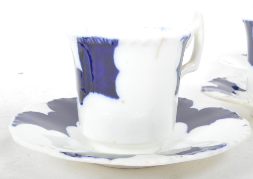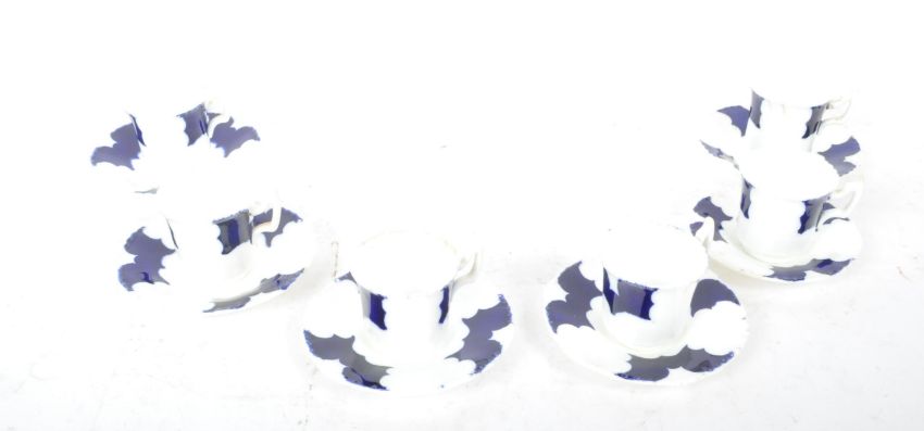 A set of six Victorian 19th century Coalport cobalt batwing porcelain coffee cups & saucers. The set having cobalt batwing shaped decoration on a white background. All marked to base.