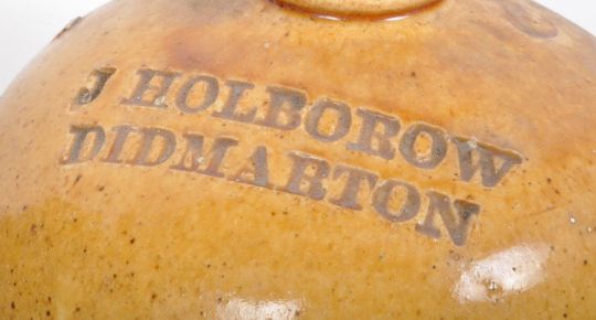 A pair of early 20th century treacle glazed stoneware jugs to include a Pickup & Co of Bristol examples dated 1939 and another with impressed marks for J. Holborow. Some chips present. Measures 28cm tall.