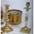 A collection of 19th century and later brass items, including three pairs of brass candlesticks comprising of a pair with inlaid mother of pearl panels, a pair of beehive candlesticks and another. Measures 26cm tall. Also a pair of Arts and Crafts brass planters comprising of pad foot example with lion head ring handles to each side and a hammered brass piece with insert within. Together with a Dutch copper plant pot with flaw feet. Measures 34cm tall.