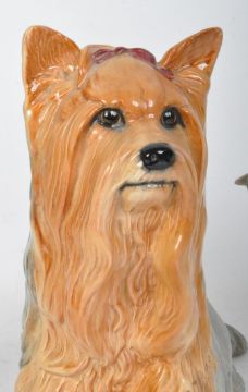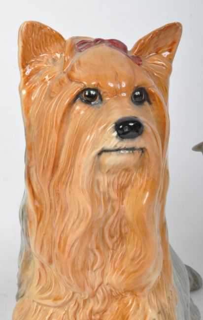 A collection of vintage 20th century Beswick figurines to include a pair of white shire horses and a large terrier dog figure. Measures 27cm tall.