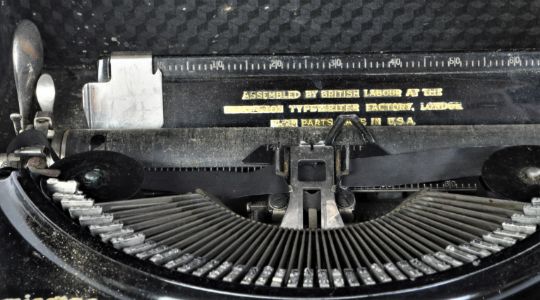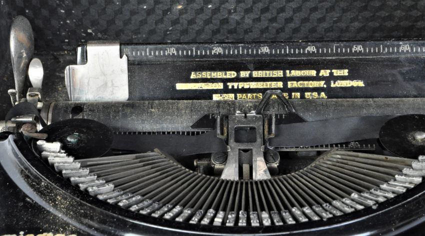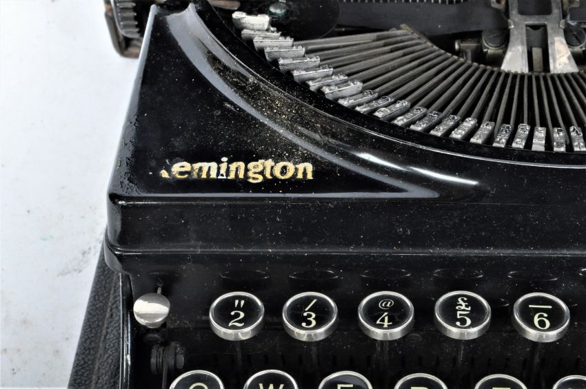 A vintage mid 20th century circa 1940s Remington "Model 5" portable typewriter with rigid case. It measures approx. 32 x 32 x 12cm.