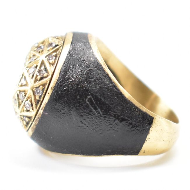A vintage 18ct gold, diamond & enamel ring. The ring having a domed head of geometric pattern & set with round cut diamonds throughout, shoulders enamelled black on a tapered shank. Marked 750.  Central stone measures approx 2 x 2 x 1.5mm. Total weight approx 12.7g. Size J.5.