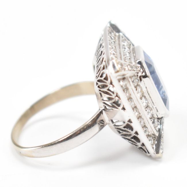 A French Art Deco sapphire and diamond ring. The ring set with an emeralds cut sapphire framed by two rows of stepped round brilliant cut diamonds having with diamond set corner fans having a pierced mount to plain band. Estimated diamond weight 1ct. Sapphire measures 11mm x 8.25mm x 6.4mm. Marked French eagle assay mark to outside of band. Weight 8.65g. Size N.