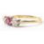 A hallmarked 18ct gold, diamond & synthetic ruby  ring. The three stone ring have a central round brilliant claw set red stone flanked by two illusion set diamonds all in a cathedral setting on pinched shank. Synthetic ruby measures approx 5 x 5 x 3mm. Diamonds measure approx 2 x 2 x 3mm. Marked 18ct. Weighs approx 2.5g. Size O.5.