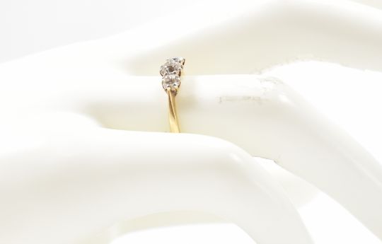 An early 20th Century 18ct gold and diamond three stone ring. The ring being set with three round old cut diamonds. Ring marked 18ct. Central diamonds measure 4 x 4.4 x 3.3mm, estimated 0.37ct, secondary diamonds measure approx 3.3 x 2.6mm.. Weight 2.0g. Size N.