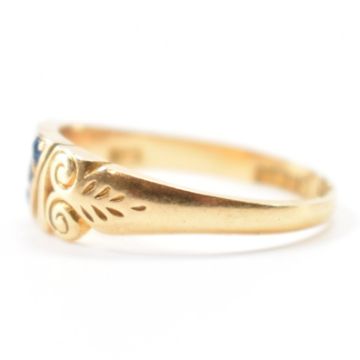 A Victorian hallmarked 18ct gold, sapphire & white stone ring. The ring having a central round cut white stone diagonally flanked by two round cut sapphires with scrolling shoulders & a tapered shank. Total weight approx 2.9g. Size N.5.
