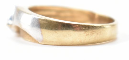 A hallmarked 9ct gold & white stone solitaire ring. The ring having a central square cut bar set white stone on sweeping design two tone shoulders & tapered shank. Stone measures approx 4.5 x 4 x 3.7mm. Hallmarked for London. Weighs approx 3.2g. Size N.