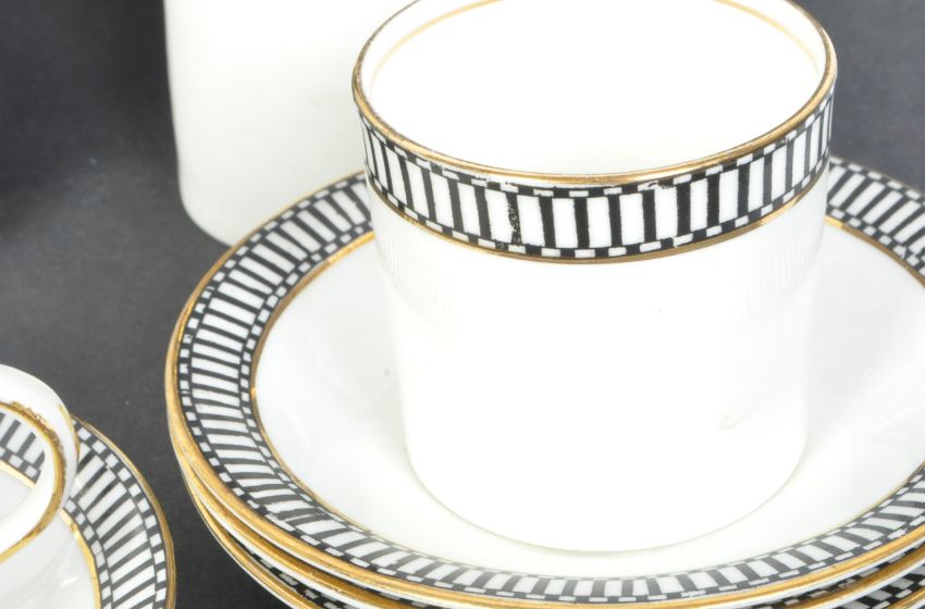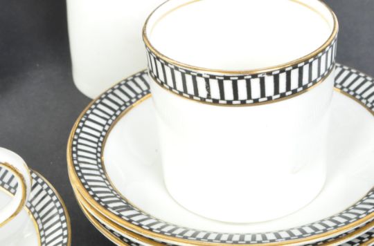 Atlas - Stoke-on-Trent - An early 20th century Art Deco 1930's Atlas China four person coffee service comprising of five saucers, four teacups and coffee pot. Each pieces having a black and white chequered border with gilt details. Measures 18cm tall. Some chips & wear to gilt.