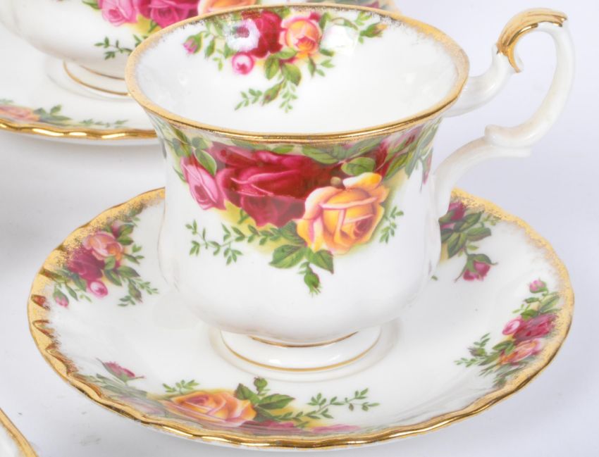 A collection of vintage 20th century bone china to include a Royal Albert teacups trio comprising of teacup, saucer and side plate alongside a soup dish and decorative wheelbarrow ornament. Together with three pieces of Paragon Queen Alexander Rose. Repair to piece of Paragon.