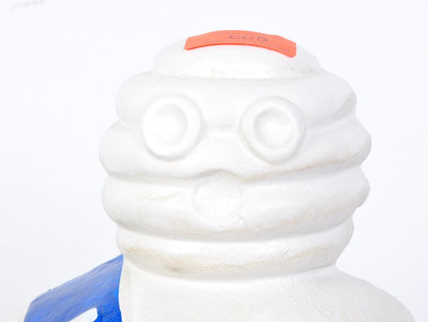 A large vintage style cast metal doorstop featuring the iconic Bibendum / Michelin Man having a blue sash raised on a demi lune base. Measures 54cm high.