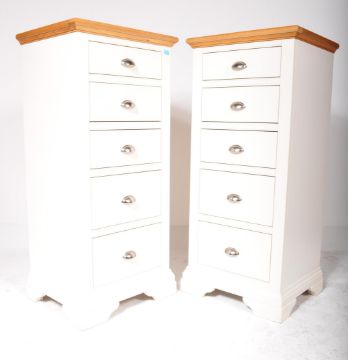 A pair of vintage 20th century Oak Furniture Land St Ives range chests. Each chest having a bank of five drawers with oak top and body in white colourway, all raised over a bracket base. 126x57x48cm