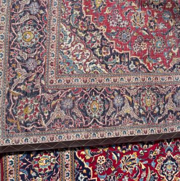 An early 20th century Persian Islamic Kashan floor carpet rug having a beige & blue central medallion enclosed in a red panel with blue outer borders with foliate patterns all around. Tassels to the ends. It measures 305 x 200cm.