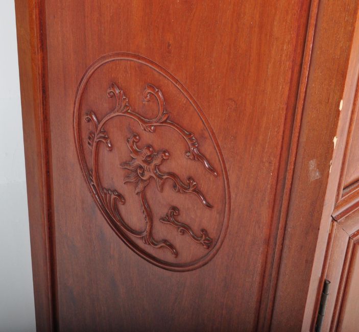 A 20th century Chinese Oriental hardwood drinks cabinet having a flared top with applied geometric detailing to the fall front door atop a double door cabinet opening to reveal a shelved interior. It measures 102x91x46cm.