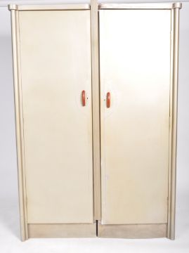 P. B. Cow & Company - Hunting Aviation Ltd - A retro 20th Century Art Deco aluminum-clad Basildon Bedroom Furniture two piece wardrobe. Twin doors with bakelite handles opening to reveal a red felt lined interior. Markes labels present to the back. Wear commensurate with age. Measures approx; 183cm x 120cm x 51cm. Please see further parts of the suite in the following lots.