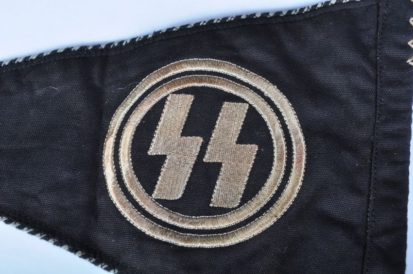 A WWII Second World War Third Reich Nazi German SS officers armoured vehicle car pennant. Double sided with embroidered SS runes and grey piping on all edges. Measures approx 35cm.
