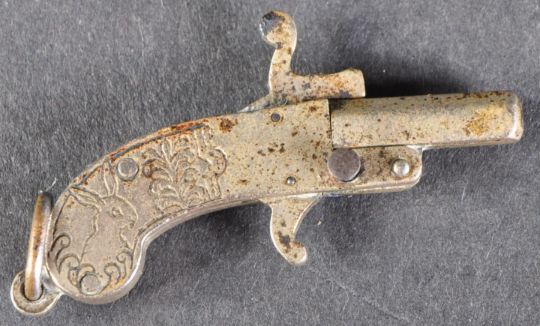 Early 20th Century sweetheart bracelet charm in the form of a flintlock pistol. The small silver tone cast metal pistol with moving trigger and cocking mechanism. The stock etched with a deer and rabbit, each with foliage. Measures approx 4cm.