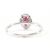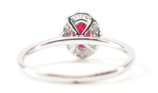 A hallmarked 18ct white gold gold ruby and diamond cluster ring. The ring set with a central oval cut ruby framed by a halo of diamonds having diamond set shoulders to plain shank. Weight 1.7g. Size O.