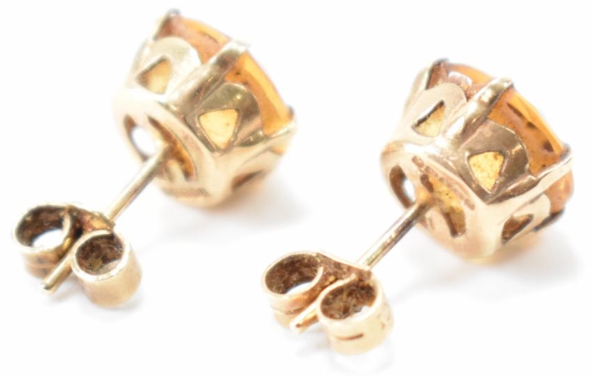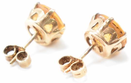 Two pairs of hallmarked 9ct yellow gold stud earrings. The first being simulated pearls with 9ct gold bar back & butterfly clasps, hallmarked for London 1972. The others having round cut fancy claw set yellow stones, hallmarked for Birmingham 1972. Total weight approx 3.5g.