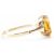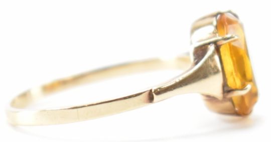 A vintage 9ct yellow gold & yellow stone ring. The ring having a a claw prong set oval cut stone to cathedral shoulders on a tapered shank. Marked 9ct. Total weight approx 1.9g. Size approx P.