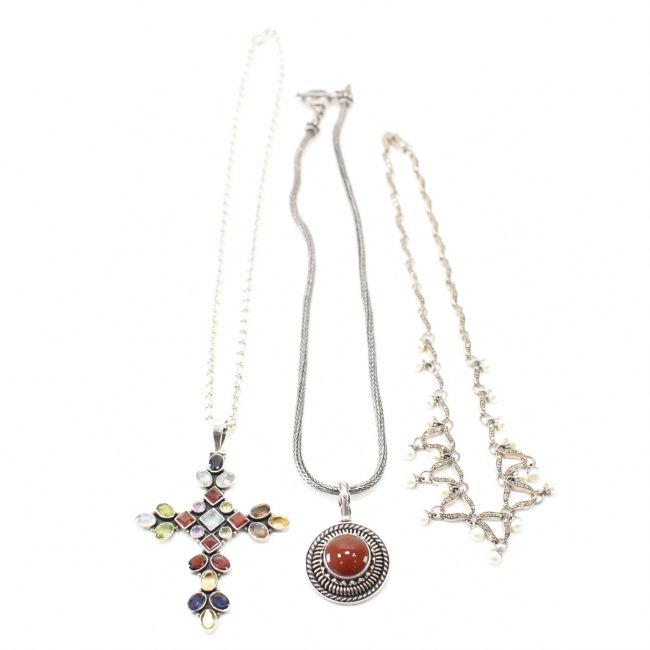 A group of three silver and white metal necklaces. The lot to include a crucifix pendant necklace set with coloured stones (chain marked 925), a Suarti pendant necklace with a red stone pendant (marked 925, Suarti), and a white metal necklace set with marcasites and cultured pearls (marked metal). Measures 18 and 15 inches. Silver weight approx 80.3g.