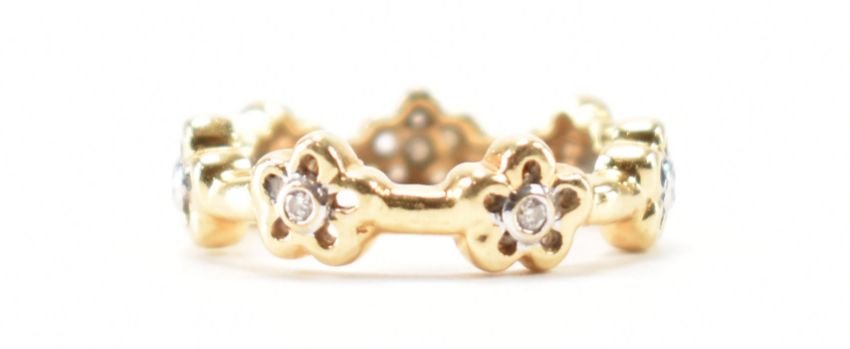 A hallmarked 18ct gold and diamond daisy chain  band ring. The ring  set with round brilliant cut diamonds to seven flower motifs. Hallmarked Sheffield. Sponsor mark FF. Weight 5.43g. Size N.