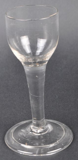An 18th Century plain stem wine drinking glass having an oval shaped bowl raised on plain stem over a folded foot base. Measures approx; 13cm tall.