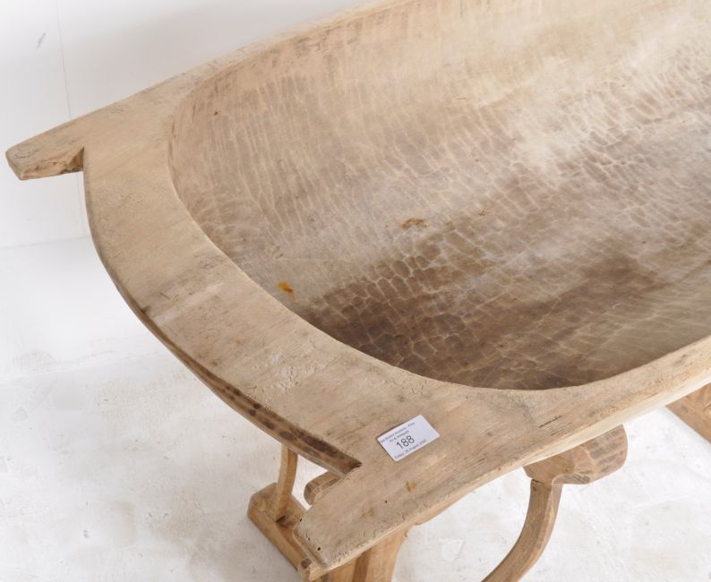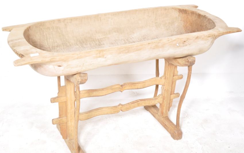 A 19th Century pine trough on stand of large form. Carrying handles to each end with all raised on a decorative carved stand. Measures approx' 76cm x 130cm x 51cm.
