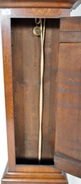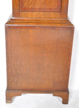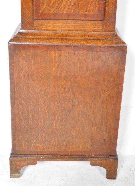 A 19th Century Victorian oak and rosewood Bristol longcase grandfather clock having a stepped hood with turned columns flanking the glazed fronted door housing the painted dial marked for J Lawley Bristol. Slender case with all raised on bracket feet. Measures approx; 200cm x 38cm x 22cm.