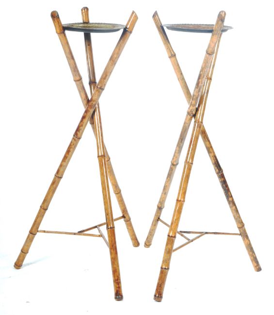A matching pair of 19th Century Victorian Aesthetic Movement bamboo stands having hand painted circular tin disc tops with floral detailing. The bamboo supports of X-frame form united by lower bamboo stretchers. Wear commensurate with age mostly to the tin painted tops, overall good examples. Each measures approx; 90cm x tall.