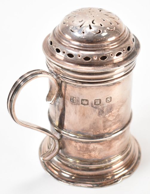 A silver hallmarked Thomas Bradbury & Sons Britannia silver flour / sugar shaker. The shaker having a stepped base with pierced lid to the top and scrolled handle. Hallmarked Sheffield 1960. Measures 10cm tall. Weight 178g.