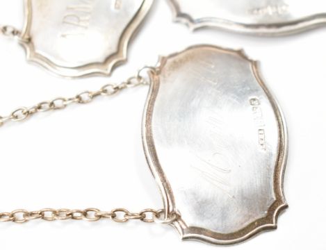 A group of four silver hallmarked decanter labels. The lot to include four labels with shaped borders suspended from chains. The labels to include Raspberry Cordial, Malt, Marsala and Armagnac. Two hallmarked Birmingham 1989 and 1999, all with sponsors marks for C Robathan & Son. Measures 4.8cm wide. Total weight 35.6g.