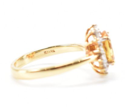 A hallmarked 18ct gold yellow sapphire and diamond halo ring. The ring being set with an oval cut yellow sapphire with a halo of round cut diamonds. Hallmarked Sheffield, Iliana. Weight 5.7g. Size Q.