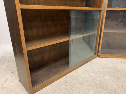 A pair of mid 20th century retro oak bookcases, each having a gallery top to back with twin sliding glazed doors opening to reveal a shelved interior. Measures 92cm x 92cm x 22cm.