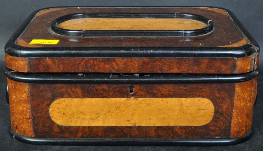 A 19th century Victorian thuya wood sewing box. The box having ebonised wooden raised detail to sides and lid, opening to reveal a fully appointed interior having a encased memoir section with velvet lining within over a needle pad with compartments below. Measures 15cm x 35cm x 23cm.